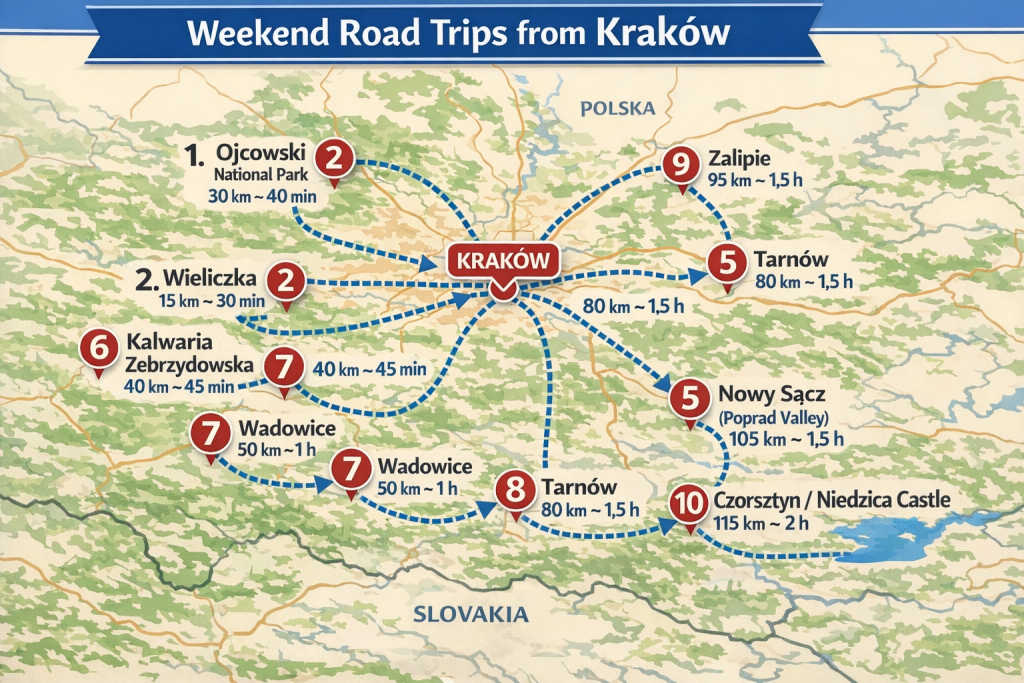 - Easy access from Kraków – most destinations are 1–2 hours away,